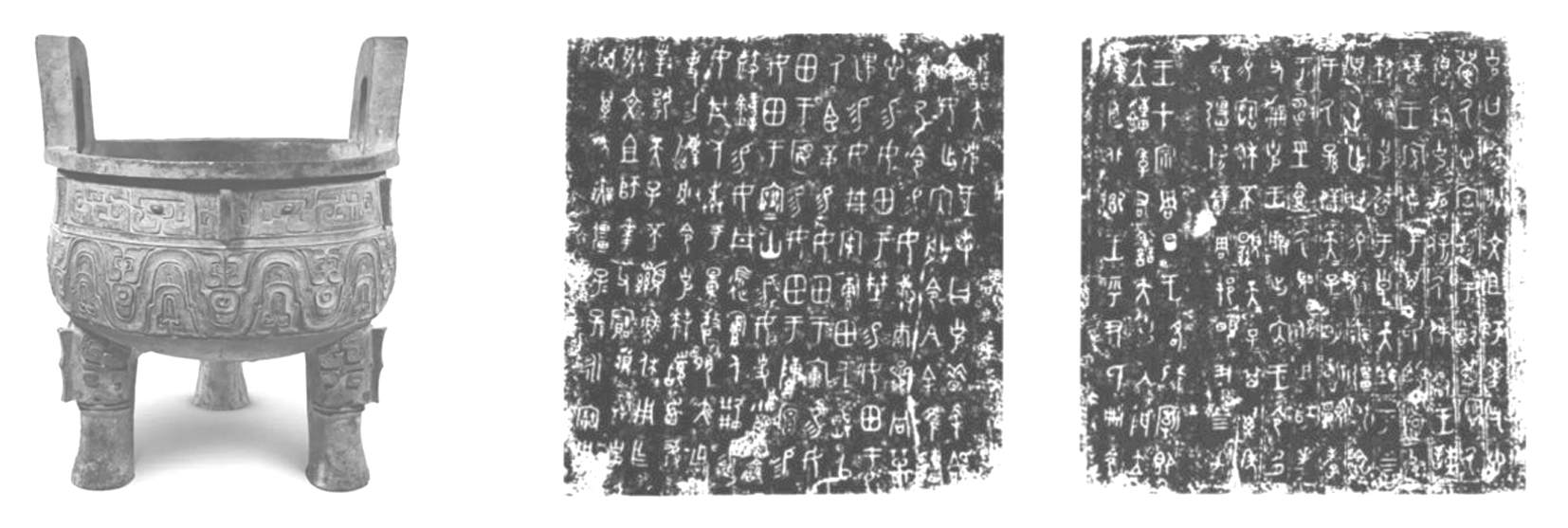 材料 如图是清光绪中期出土于陕西扶风县法门镇的西周大克鼎。鼎腹内壁亦铸有铭文2段,共28行,290字,主要记录“克”依凭先祖功绩,受到周王的策命和大量土地、奴隶的赏赐内容。鼎高93.1厘米,重201.5千克,口径75.6厘米。造型宏伟古朴,鼎口之上竖立双耳,底部三足已开始向西周晚期的兽蹄形演化,显得沉稳坚实。纹饰是三组对称的变体夔纹和宽阔的窃曲纹,线条雄浑流畅。