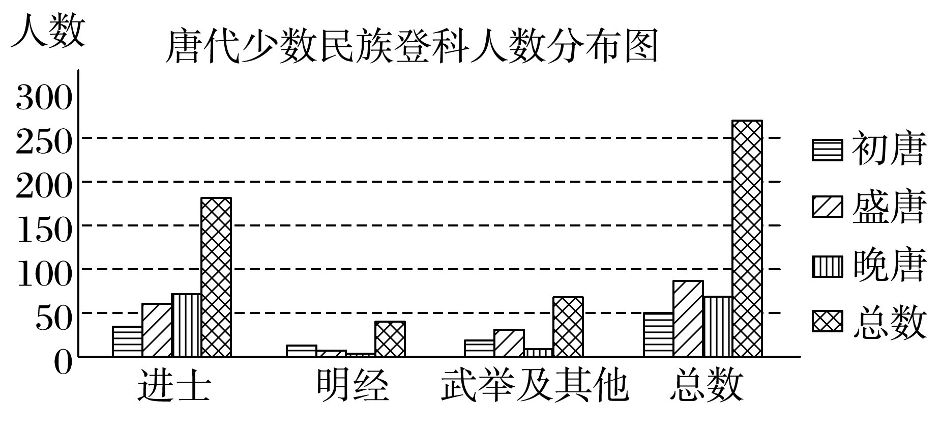 唐朝政府允许少数民族的读书人参加科举,其登科者总数整体呈上升趋势,体现了唐朝开明的民族政策,D项正确;材料涉及唐朝少数民族科举情况,不能说明科举制侧重于进士和明经科目,排除A项;B项说法符合史实,但在图示中无法得出,排除;“各类实用性人才”表述夸大其词,排除C项。