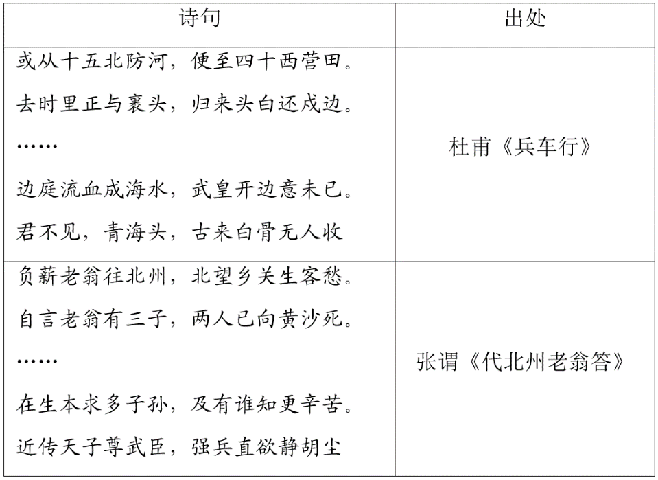 杜甫和张谓的诗中都描述了由于边疆战事不断,政府征兵频繁,百姓困苦,这可以用来印证当时边疆形势的严峻,A项正确;材料中未提到赋税制度的变化,排除B项;材料主旨是政府征兵,边疆战事,说明当时中原王朝和边疆民族之间的关系比较紧张,排除C项;材料涉及的是边疆地区,而非藩镇割据,且藩镇割据局面出现是在安史之乱之后,排除D项。