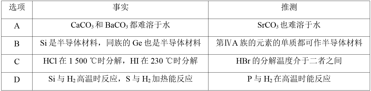 同一主族元素的性质相似,CaCO3和BaCO3都难溶于水,因此SrCO3也难溶于水,A项正确;在元素周期表中,位于金属和非金属分界线附近的元素的单质能作半导体材料,Pb不位于金属元素和非金属元素分界线附近,所以Pb不能作半导体材料,B项错误;元素的非金属性越强,其氢化物的稳定性越强,非金属性:Cl>Br>I,所以氢化物的稳定性:HCl>HBr>HI,则HBr的分解温度介于二者之间,C项正确;元素的非金属性越强,其单质与氢气反应越容易,非金属性:S>P>Si,所以P与H2在高温时能反应,D项正确。