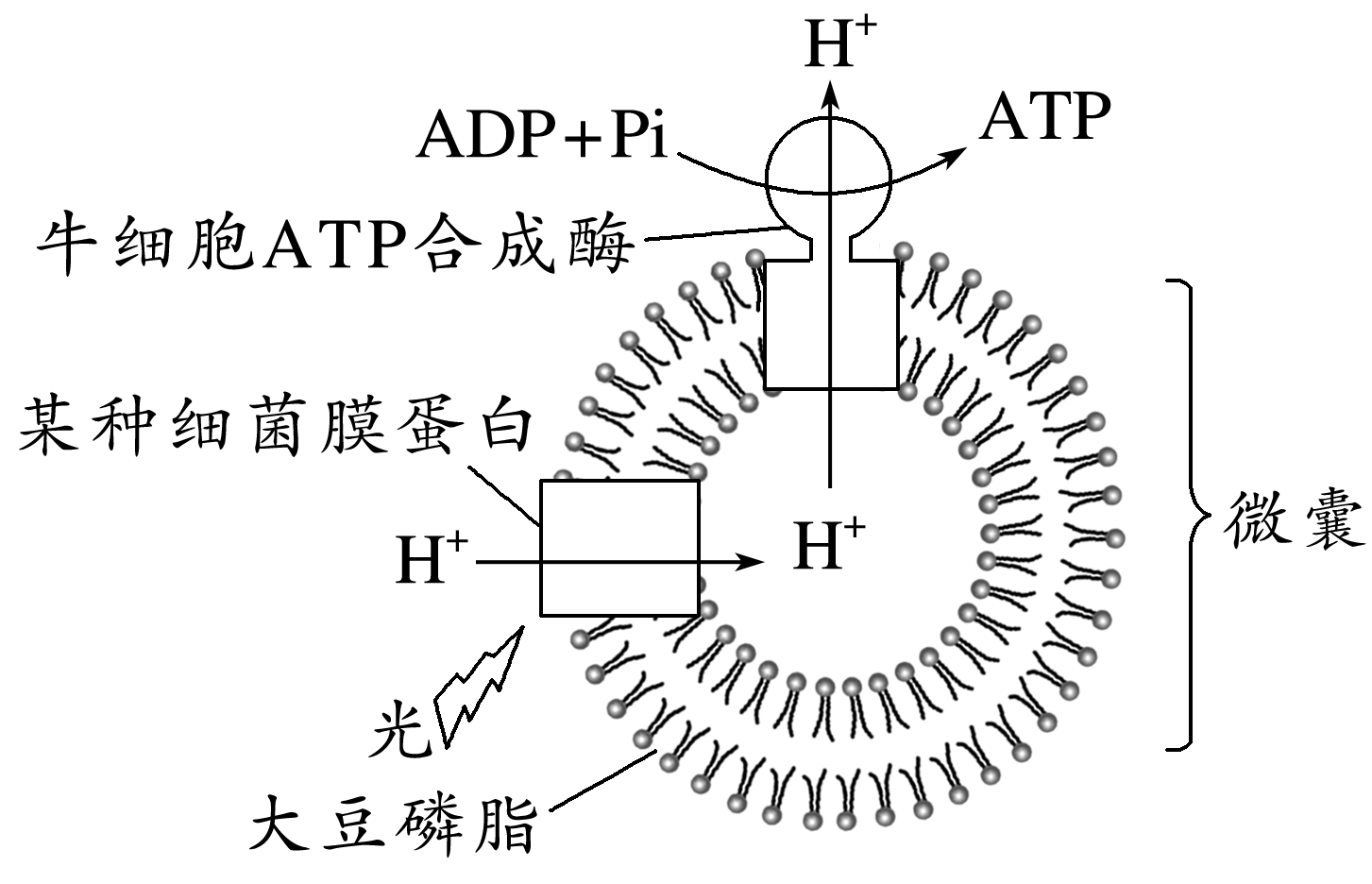 以天然生物活性分子为基元,利用分子组装策略构建的新型仿生体系能模拟生命活动基本单位的结构与功能,有助于研究人员在分子层面上理解与认知生命活动的本质与物理化学机制,新型仿生体系已发展成为组装生物学的研究新方向,我国科学家在类细胞微囊体上实现了ATP合成酶功能的体外模拟(如图所示)。