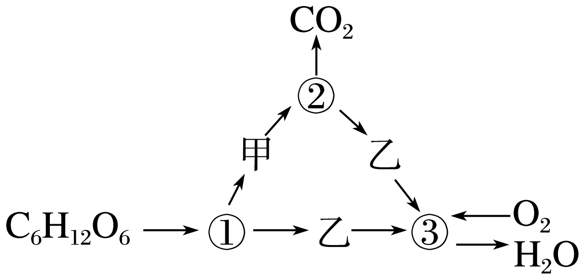(2024·宁波高一期末)某同学体内细胞呼吸的过程如图所示,①②③为相关生理过程发生的场所,甲、乙代表有关物质。下列叙述正确的是( )