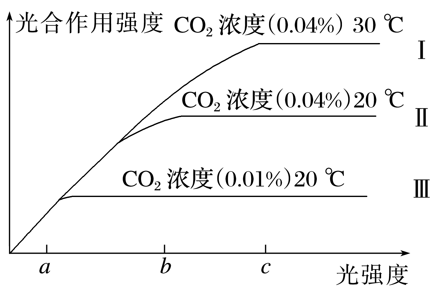 光强度小于a时,不同的CO2浓度下,在相同的光强度下光合作用强度相同,随着光强度的增加,光合作用强度随之增加,所以限制光合作用强度的主要因素是光强度,B正确;将植物从曲线Ⅱ移到曲线Ⅲ环境条件下培养一段时间,光合作用的光反应和碳反应速率都降低,植物细胞五碳糖含量和三碳酸含量保持相对稳定,C错误;光合作用需要酶的催化,温度能影响酶的活性,所以温度通过改变酶的活性来影响光合作用强度,D正确。