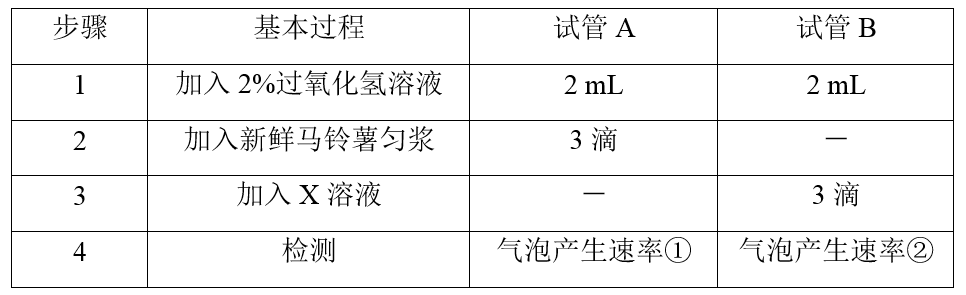 (4)如果表中X溶液为煮熟马铃薯匀浆,研究人员检测发现试管B中气泡产生速率较A试管明显减少,可能的原因是___________________________________。