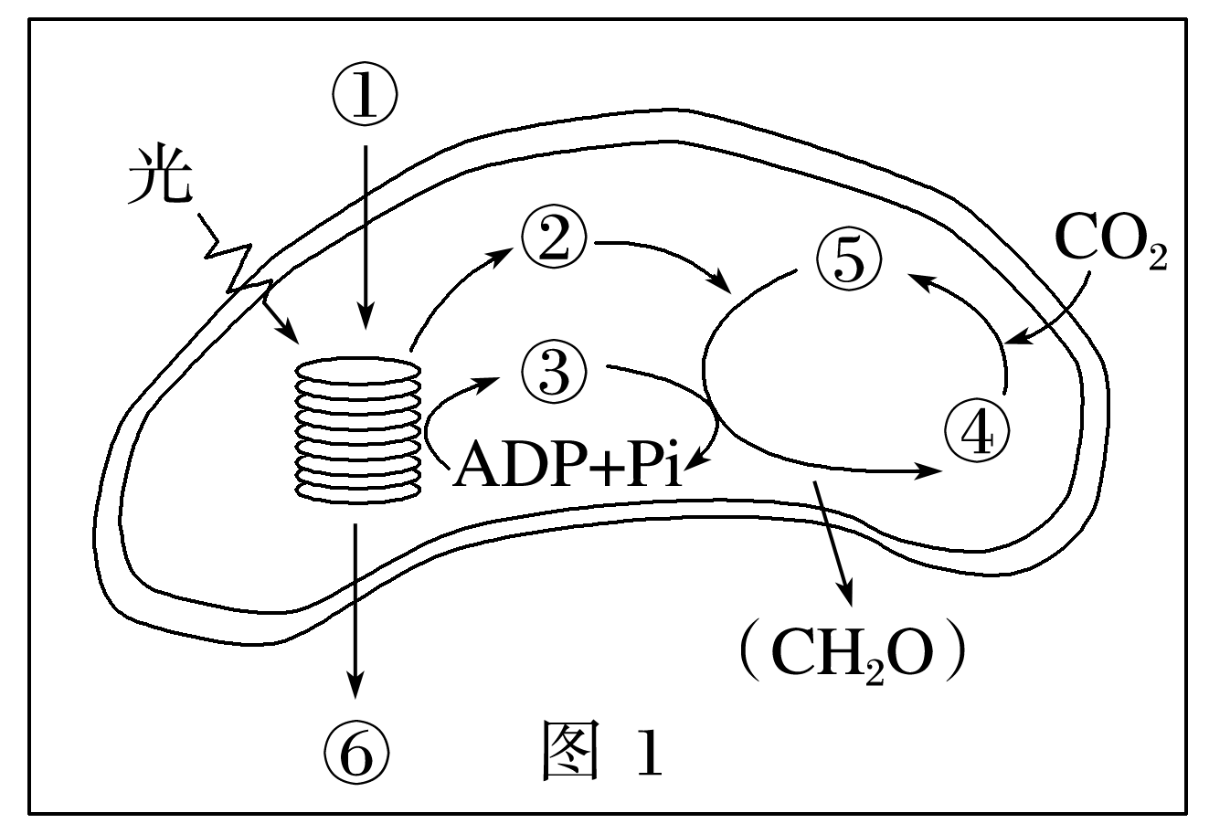(1)光合色素分布在叶绿体的________(填结构名称)中,可用________法对叶绿体中的光合色素进行分离。结合图1分析,①在光下裂解产生__________________,⑤被________还原形成三碳糖,其中部分三碳糖再生成________(填名称)以保证卡尔文循环不断进行。