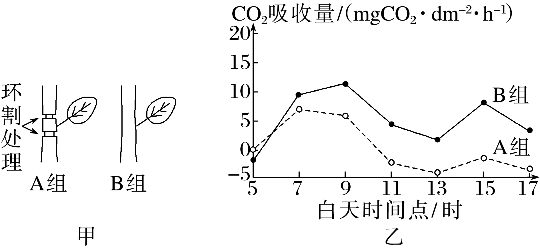 (2)图乙中B组叶片5时到17时有机物变化情况为________(填“增加”“减少”或“不变”),B组叶片白天氧气释放速率最快的时间是________时。7时以后,相同时刻环割处理的A组光合速率比B组________(填“小”“大”或“相同”),由此可以得出的结论是________________________________________________________________________。