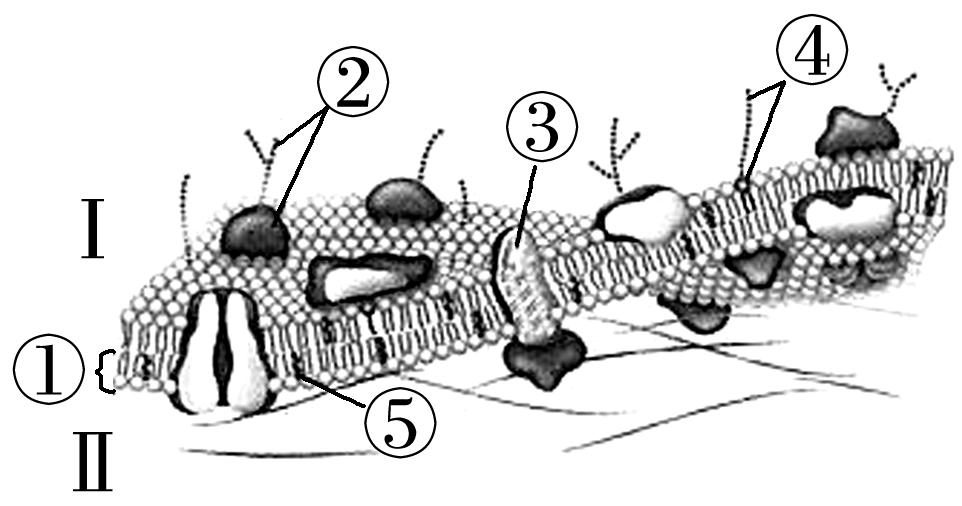 (2024·丽水高一期中)如图是1972年辛格和尼克尔森根据多个实验的证据提出的生物膜流动镶嵌模型,其中Ⅰ与Ⅱ表示膜的两侧,①~⑤表示膜的组成成分。下列叙述错误的是( )